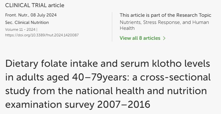 无独有偶,遵义医科大学的研究人员也曾在《营养领域》上发表过一项研究,研究同样强调了天然食物摄入叶酸对健康的重要性,通过天然食物补充叶酸会显著影响血清Klotho水平,该物质对延缓衰老进程有作用。
